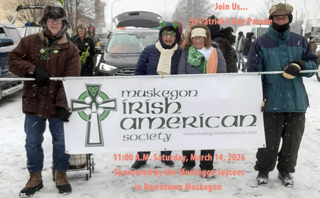 Below are pictures from a busy, busy weekend for Muskegon Irish Folk starting with the St. Patrick’s Day Parade on Saturday, March 16, followed on Sunday by the Muskegon Irish American Society’s 51st Annual Irish Flag Raising over Muskegon and, a hooley at the Knights of Columbus!!!! To view the pictures, click on one of the photos below then click the arrows on the left or right to view the gallery of pictures.